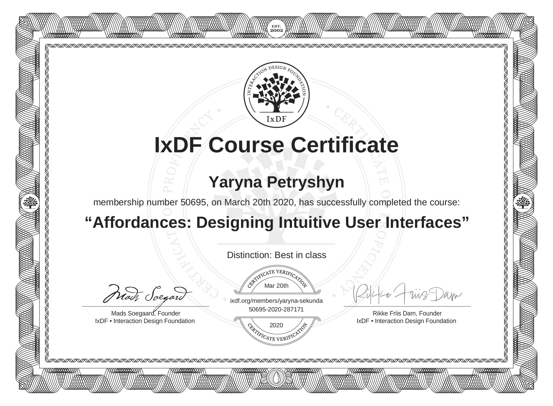 The IxDF Course Certificate above is awarded to Yaryna Petryshyn with a Best in Class Distinction in formal recognition of their coursework surpassing the rigorous benchmarks of exceptional performance established by the IxDF Educational Codex.