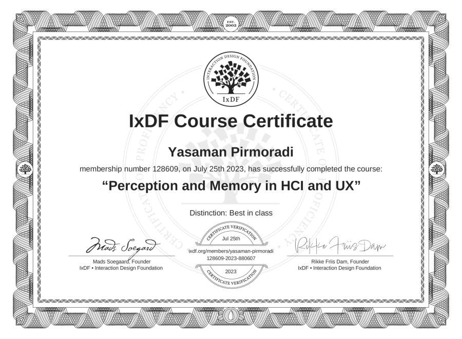 Yasaman Pirmoradi's IxDF Course Certificate: Perception and Memory in HCI and UX