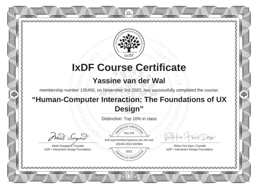 Yassine van der Wal's IxDF Course Certificate: Human-Computer Interaction: The Foundations of UX Design