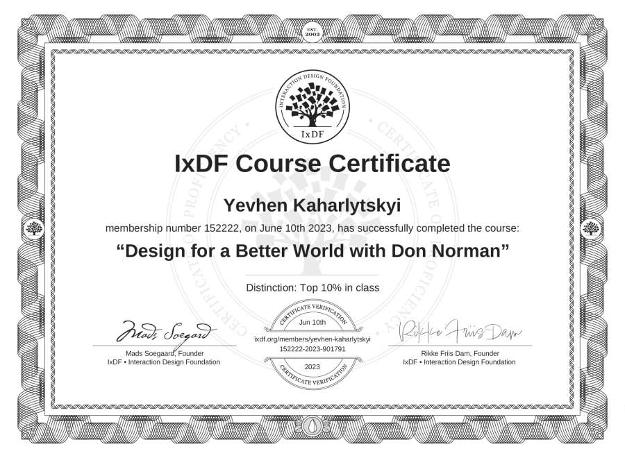 The IxDF Course Certificate above is awarded to Yevhen Kaharlytskyi with a Top 10% Distinction in formal recognition of their coursework surpassing the rigorous benchmarks of exceptional performance established by the IxDF Educational Codex.