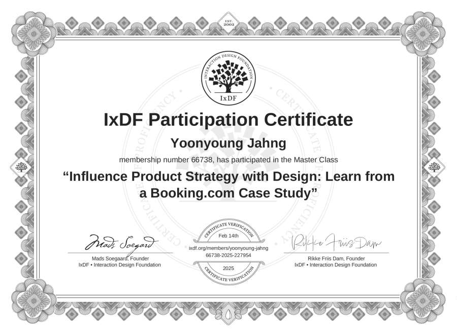 Yoonyoung Jahng's IxDF Masterclass Certificate: Influence Product Strategy with Design: Learn from a Booking.com Case Study
