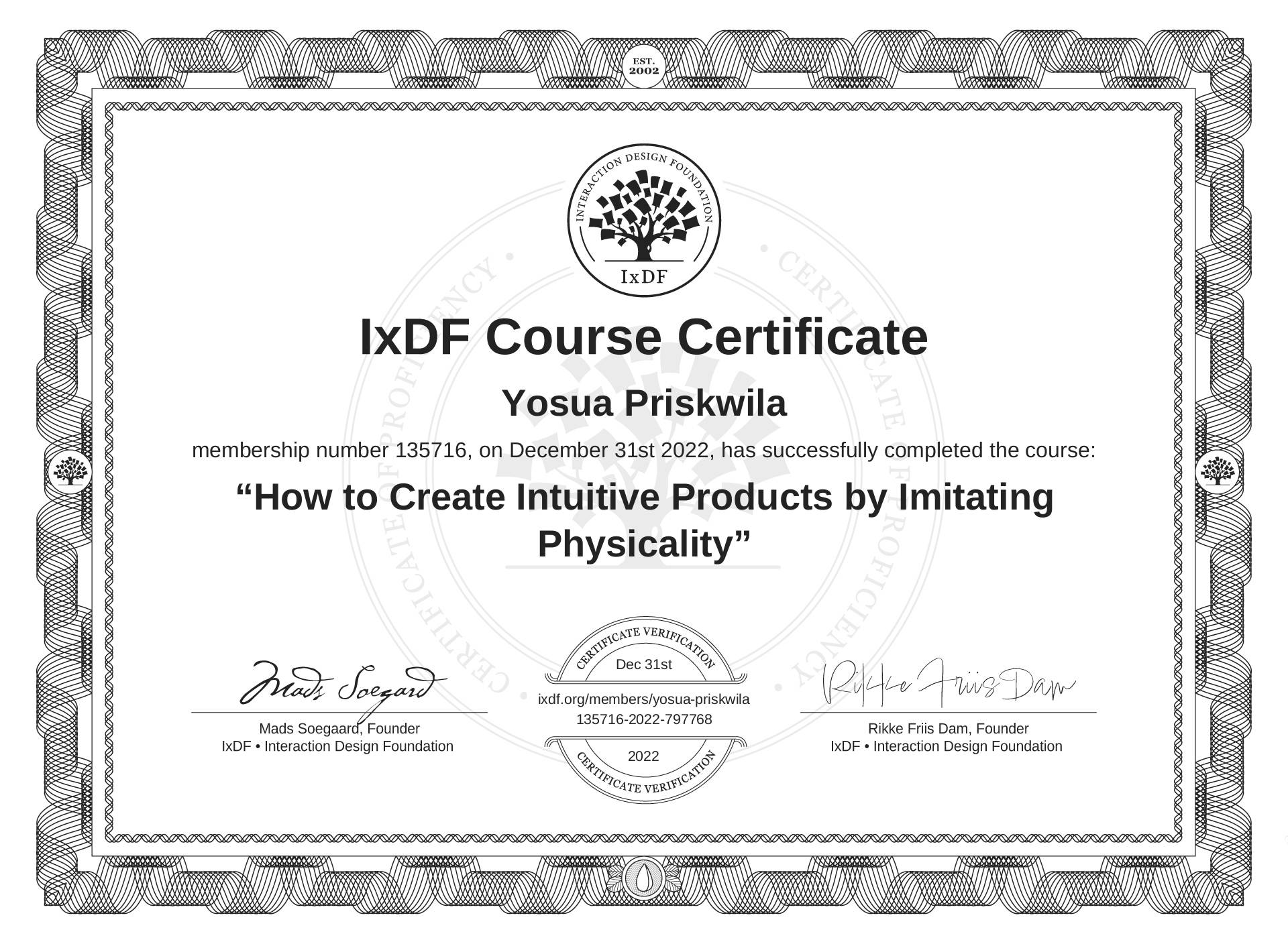Yosua Priskwila's IxDF Course Certificate: How to Create Intuitive Products by Imitating Physicality