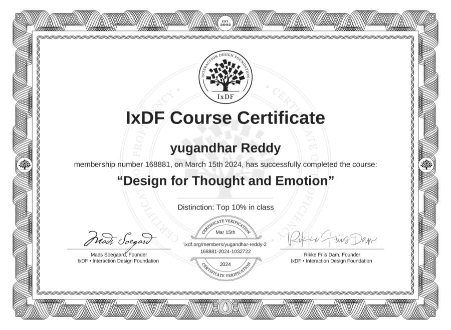 yugandhar Reddy's IxDF Course Certificate: Design for Thought and Emotion