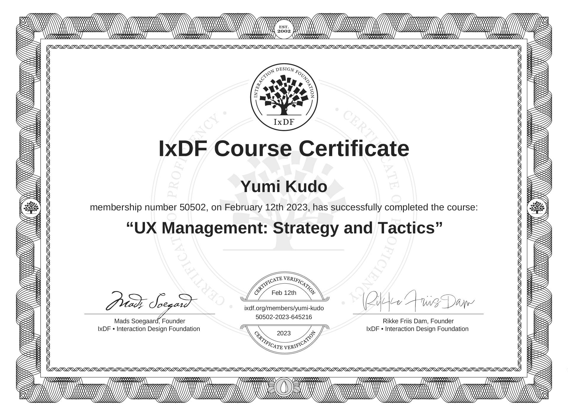 Yumi Kudo's IxDF Course Certificate: UX Management: Strategy and Tactics