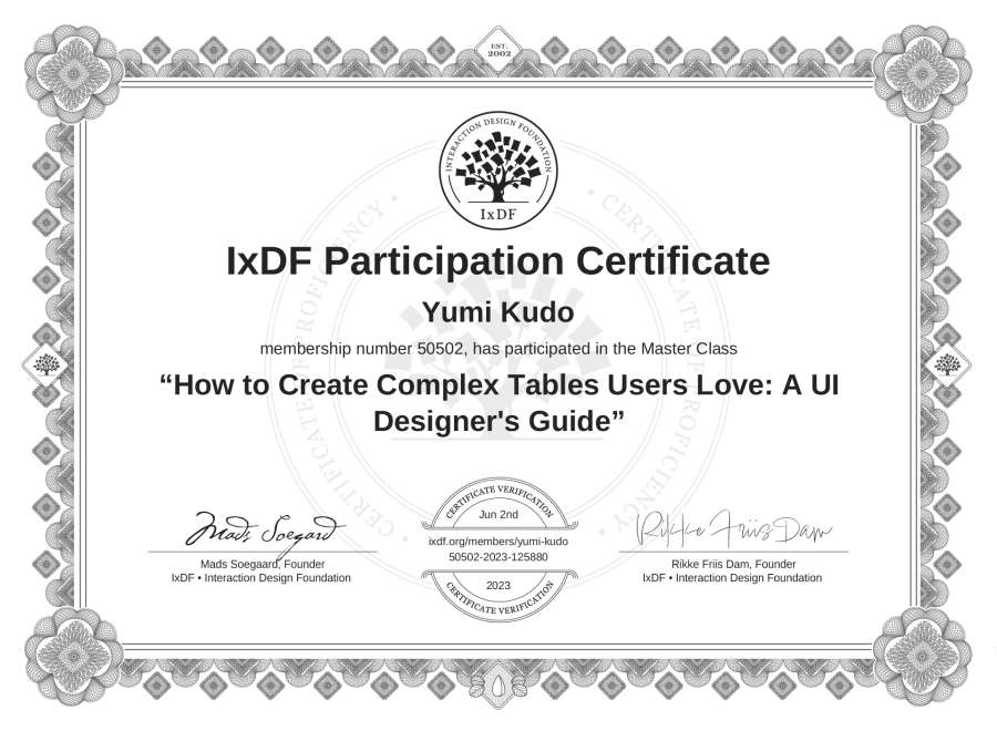 Yumi Kudo's IxDF Masterclass Certificate: How to Create Complex Tables Users Love: A UI Designer's Guide