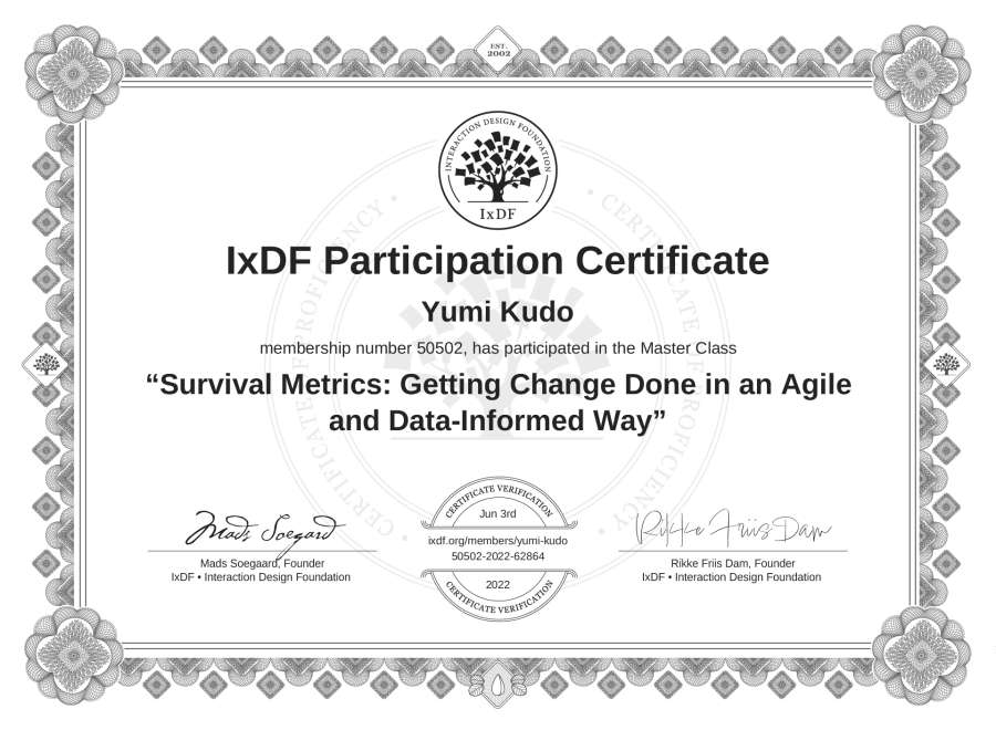 Yumi Kudo's IxDF Masterclass Certificate: Survival Metrics: Getting Change Done in an Agile and Data-Informed Way