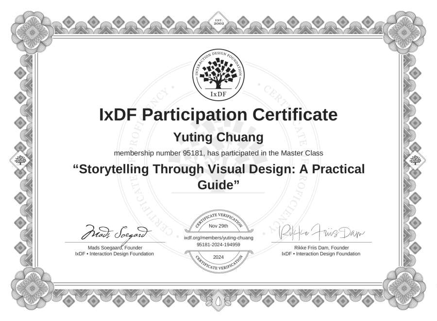 Yuting Chuang's IxDF Masterclass Certificate: Storytelling Through Visual Design: A Practical Guide