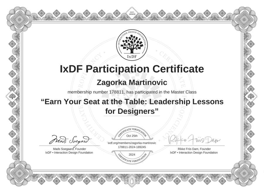 Zagorka Martinovic's IxDF Masterclass Certificate: Earn Your Seat at the Table: Leadership Lessons for Designers