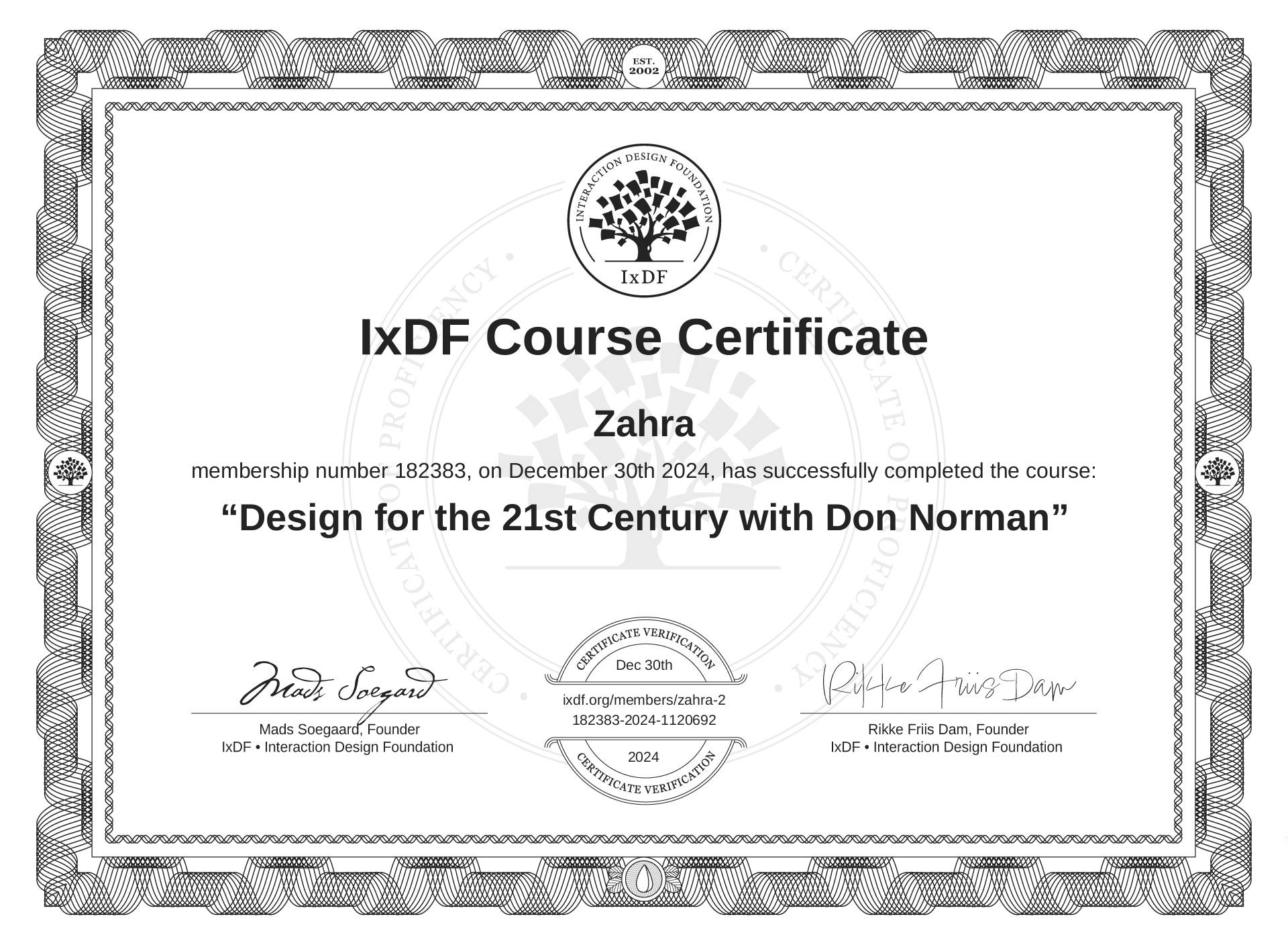 The IxDF Course Certificate above is awarded to Zahra in formal recognition of their coursework surpassing the rigorous benchmarks of exceptional performance established by the IxDF Educational Codex.