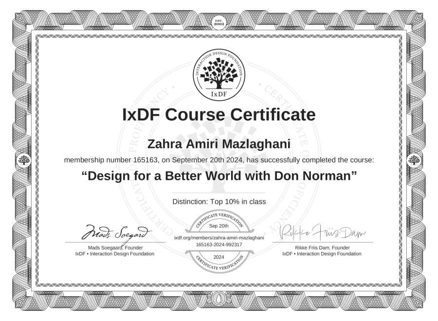 Zahra Amiri Mazlaghani's IxDF Course Certificate: Design for a Better World with Don Norman