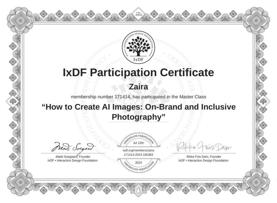 Zaira's IxDF Masterclass Certificate: How to Create AI Images: On-Brand and Inclusive Photography