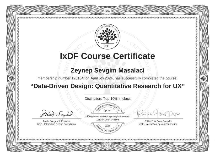 Zeynep Sevgim Maşalacı's IxDF Course Certificate: Data-Driven Design: Quantitative Research for UX