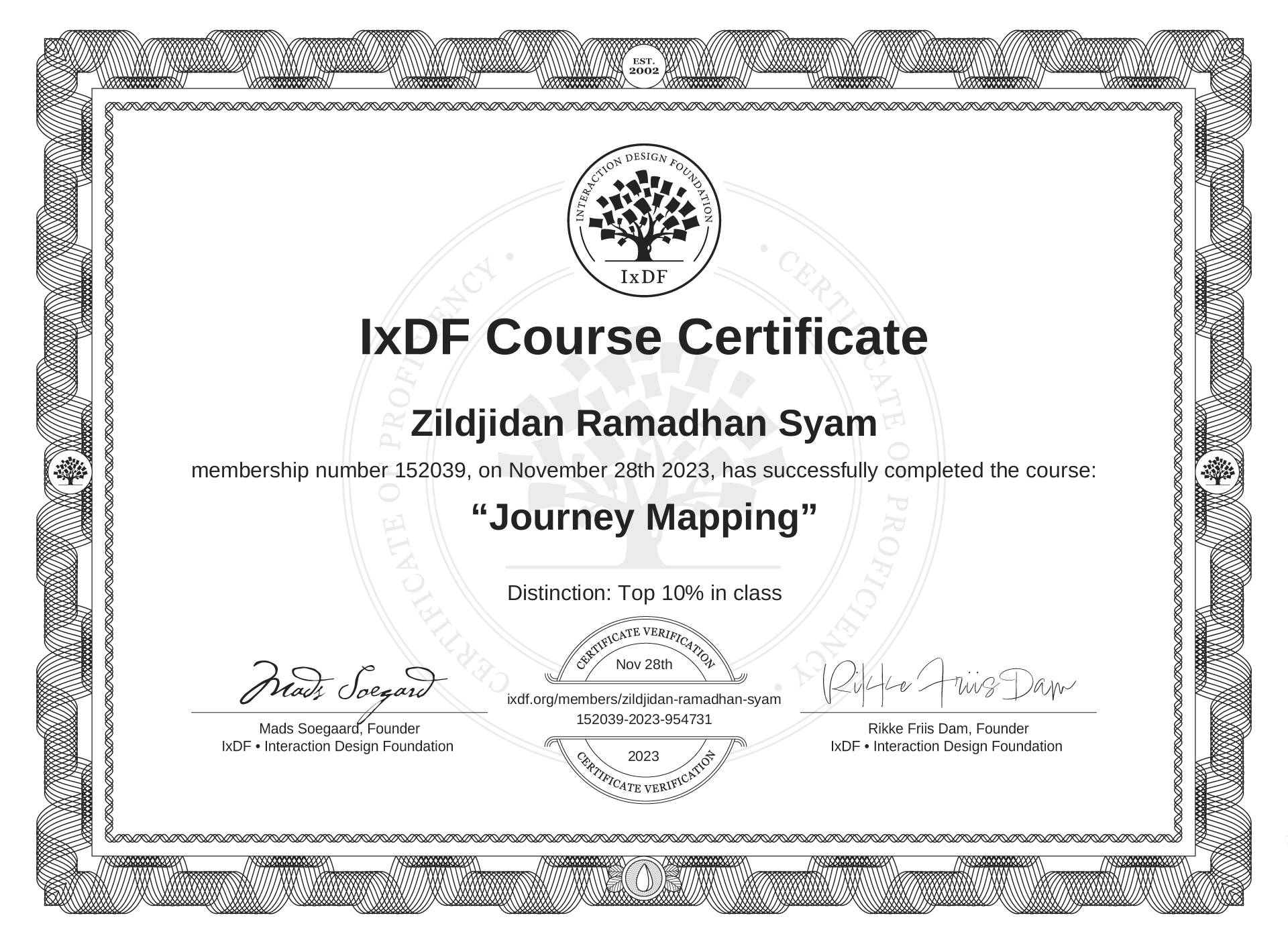 The IxDF Course Certificate above is awarded to Zildjidan Ramadhan Syam with a Top 10% Distinction in formal recognition of their coursework surpassing the rigorous benchmarks of exceptional performance established by the IxDF Educational Codex.