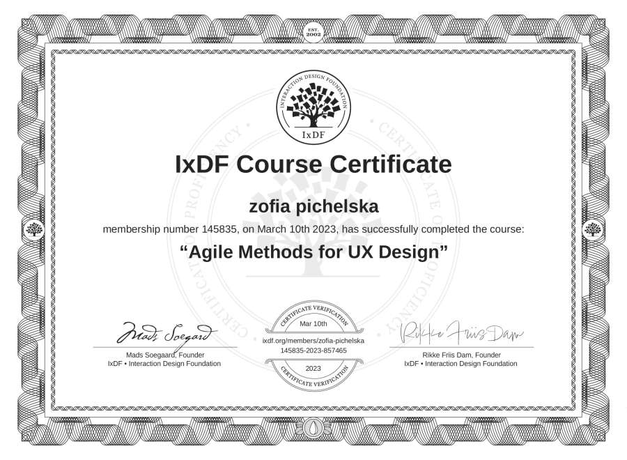 The IxDF Course Certificate above is awarded to zofia pichelska in formal recognition of their coursework surpassing the rigorous benchmarks of exceptional performance established by the IxDF Educational Codex.