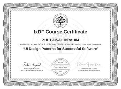 IxDF Course Certificates are awarded to ZUL FAISAL IBRAHIM in formal recognition of their coursework surpassing the rigorous benchmarks of exceptional performance established by the IxDF Educational Codex.