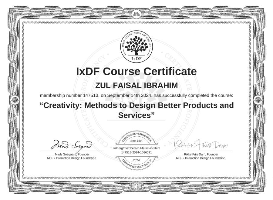 ZUL FAISAL IBRAHIM's IxDF Course Certificate: Creativity: Methods to Design Better Products and Services